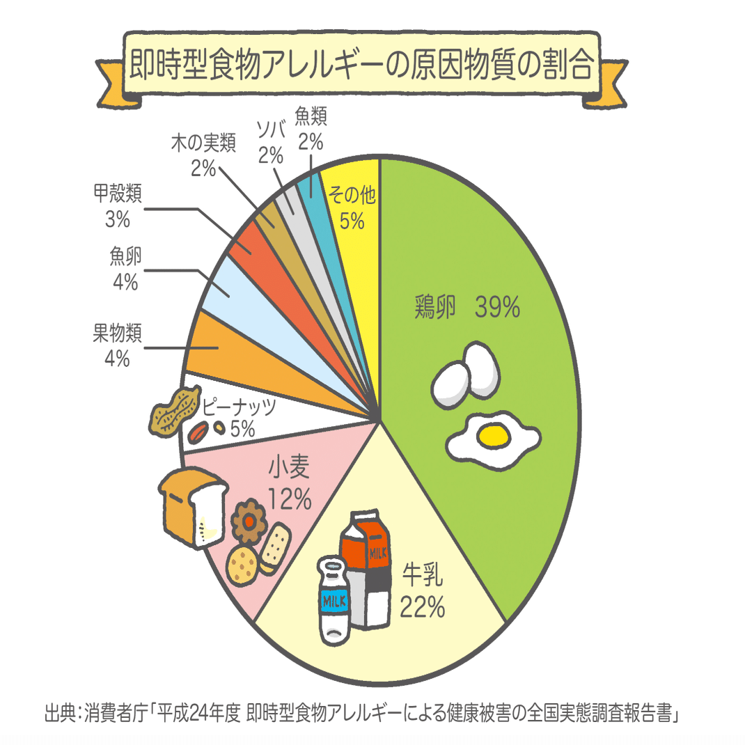 卵・乳・小麦で全食物アレルギーの約2/3を占めます。